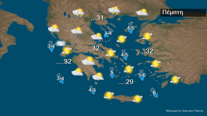 Στην κεντρική Μακεδονία, τις Σποράδες, τη βόρεια Εύβοια και τη Θεσσαλία προβλέπονται νεφώσεις παροδικά αυξημένες με τοπικές βροχές. Από τις μεσημβρινές ώρες οι νεφώσεις θα αυξηθούν και θα εκδηλωθούν και μεμονωμένες καταιγίδες κυρίως στα ορεινά της Μακεδονίας και της Θεσσαλίας ενω τα φαινόμενα το βράδυ θα εξασθενήσουν. Στις υπόλοιπες περιοχές γενικά αίθριος καιρός, όμως τις μεσημβρινές και απογευματινές ώρες στα ηπειρωτικά θα αναπτυχθούν νεφώσεις και θα εκδηλωθούν τοπικοί όμβροι και κυρίως στα ορεινά μεμονωμένες καταιγίδες. Η ορατότητα θα είναι τοπικά περιορισμένη τις πρωινές ώρες στα δυτικά. Οι άνεμοι στα δυτικά θα είναι μεταβλητοί ασθενείς 3 με 4 μποφόρ, στις υπόλοιπες περιοχές θα πνέουν από βόρειες διευθύνσεις 3 με 5 και στο Αιγαίο τοπικά 6 μποφόρ. Η θερμοκρασία δεν θα σημειώσει αξιόλογη μεταβολή. Θα φτάσει στα ηπειρωτικά κατά τόπους τους 28 με 30 βαθμούς, στα νησιά του Αιγαίου τους 27 με 29 και στο Ιόνιο τους 29 με 30 βαθμούς Κελσίου.