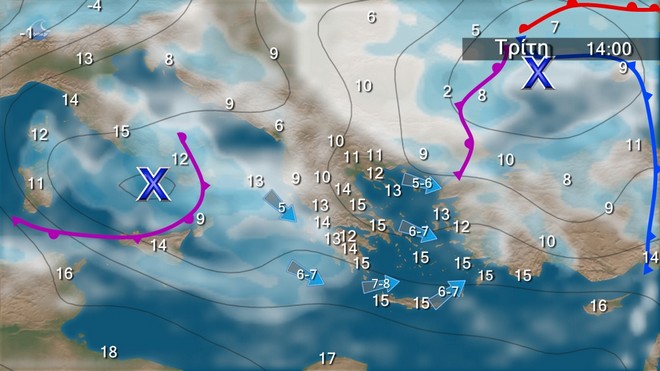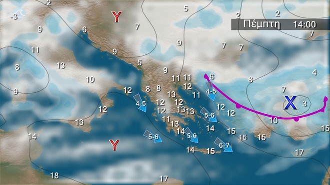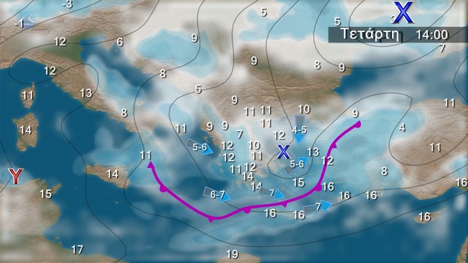 Νεφώσεις με τοπικές βροχές. Σποραδικές καταιγίδες θα εκδηλωθούν στα δυτικά, τη Θράκη, τα νησιά του ανατολικού Αιγαίου, τα Δωδεκάνησα και από το μεσημέρι στη Μακεδονία. Χιονοπτώσεις θα σημειωθούν στα ηπειρωτικά ορεινά και κατά τόπους στα βόρεια ημιορεινά. Τα φαινόμενα που πιθανώς πρόσκαιρα στα δυτικά να είναι κατά τόπους έντονα, από τη νύχτα θα εξασθενήσουν. Οι άνεμοι θα πνέουν στα δυτικά δυτικοί νοτιοδυτικοί 4 με 6 στρεφόμενοι γρήγορα σε βορειοδυτικούς και ενισχυόμενοι μετά το μεσημέρι στο Ιόνιο στα 7 με 8 μποφόρ. Στα ανατολικά θα πνέουν νότιοι νοτιοδυτικοί 4 με 6 και στο Αιγαίο τοπικά 7 μποφόρ, στρεφόμενοι από το απόγευμα σταδιακά σε δυτικούς βορειοδυτικούς 6 με 7 και στο νότιο Αιγαίο τοπικά 8 μποφόρ. Η θερμοκρασία θα σημειώσει πτώση, κυρίως στο Ιόνιο και τα ηπειρωτικά.