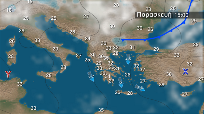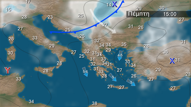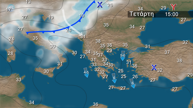 Στη Μακεδονία, τη Θράκη, τη Θεσσαλία και βαθμιαία τα νησιά του βορείου Αιγαίου λίγες νεφώσεις παροδικά αυξημένες, κυρίως τις μεσημβρινές και απογευματινές ώρες με τοπικούς όμβρους ή σποραδικές καταιγίδες και βελτίωση το βράδυ από τα δυτικά. Στην υπόλοιπη χώρα γενικά αίθριος καιρός και μόνο τις μεσημβρινές και απογευματινές ώρες θα αναπτυχθούν πρόσκαιρες νεφώσεις στα ανατολικά ηπειρωτικά όπου θα εκδηλωθούν τοπικοί όμβροι κυρίως στα ορεινά. Οι άνεμοι θα πνέουν στα δυτικά βόρειοι βορειοδυτικοί 4 με 6 και από το απόγευμα στο Ιόνιο τοπικά 7 μποφόρ. Στα υπόλοιπα από βόρειες διευθύνσεις 3 με 5 και στο Αιγαίο από το απόγευμα τοπικά 6 μποφόρ. Η θερμοκρασία θα σημειώσει μικρή πτώση κυρίως στα ανατολικά.