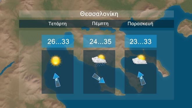 Γενικά αίθριος καιρός. Τοπικές νεφώσεις στην Ήπειρο, τη Θεσσαλία, τη δυτική και κεντρική Μακεδονία τις απογευματινές ώρες, με τοπικούς όμβρους και πιθανώς μεμονωμένες καταιγίδες στα ορεινά της Μακεδονίας. Οι άνεμοι θα πνέουν από βόρειες διευθύνσεις 3 με 5, πρόσκαιρα στο Αιγαίο και από το βράδυ στο Ιόνιο τοπικά 6 μποφόρ. Η θερμοκρασία θα διατηρηθεί σε υψηλά επίπεδα στο μεγαλύτερο μέρος της χώρας.