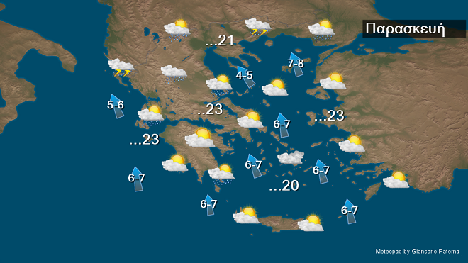 Οι μετεωρολογικές συνθήκες ευνοούν τη μεταφορά αφρικανικής σκόνης. Οι άνεμοι θα πνέουν στα δυτικά νότιοι νοτιοανατολικοί 4 με 6 που βαθμιαία θα στραφούν σε δυτικούς νοτιοδυτικούς έως 5. Στα ανατολικά νότιοι νοτιοανατολικοί 6 με 7 τοπικά 8 μποφόρ. Η θερμοκρασία θα σημειώσει μικρή πτώση στα δυτικά και βόρεια.