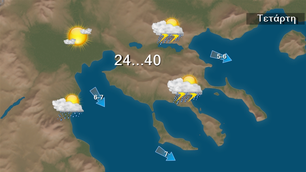 Σήμερα Τετάρτη προβλέπεται γενικά αίθριος καιρός, όμως από το μεσημέρι στη βορειοδυτική χώρα και πιο συγκεκριμένα στο βόρειο Ιόνιο, την Ήπειρο και τη δυτική Μακεδονία η καιρική κατάσταση θα αλλάξει, με πρόσκαιρες καταιγίδες και κυρίως με πολύ ενισχυμένους δυτικούς βορειοδυτικούς ανέμους. Τα έντονα αυτά φαινόμενα θα επηρεάσουν από το απόγευμα την κεντρική Μακεδονία, τη Θεσσαλία και τις Σποράδες και βαθμιαία το βόρειο Αιγαίο. Οι άνεμοι θα πνέουν νότιοι νοτιοδυτικοί 3 με 5 μποφόρ, γρήγορα όμως στα δυτικά και βαθμιαία στην υπόλοιπη χώρα θα στραφούν σε δυτικούς βορειοδυτικούς 4 με 6 και πρόσκαιρα τοπικά 7 μποφόρ. Η θερμοκρασία σε πολλές περιοχές της ανατολικής χώρας θα σημειώσει άνοδο κατά 1 με 2 βαθμούς. Οι μέγιστες τιμές θα φτάσουν στη Θεσσαλία, την ανατολική Στερεά και την ανατολική Πελοπόννησο τους 43 με 45 βαθμούς και τοπικά στο εσωτερικό της ανατολικής Στερεάς και της ανατολικής Πελοποννήσου τους 46 βαθμούς Κελσίου. Στη Θράκη, την κεντρική και ανατολική Μακεδονία, τη δυτική Πελοπόννησο και τα νησιά του ανατολικού Αιγαίου θα φτάσουν τους 40 με 42 βαθμούς, στην Κρήτη, τις Κυκλάδες, τις Σποράδες και τα Δωδεκάνησα τους 39 με 41 βαθμούς και στα νησιά του Ιονίου, την Ήπειρο, τη δυτική Στερεά και τη δυτική Μακεδονία τους 38 με 39 βαθμούς Κελσίου.