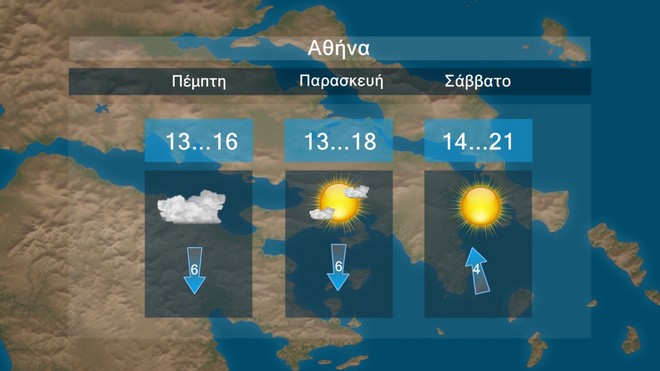Την Πέμπτη προβλέπεται συννεφιά στην Αθήνα και ψύχρα, αλλά από την Παρασκευή και μετά ο καιρός θα βελτιωθεί και η θερμοκρασία θα ανέβει στους 21 βαθμούς το Σάββατο.