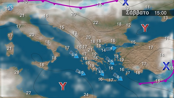 Στα κεντρικά και νότια νεφώσεις με τοπικές βροχές στη νότια νησιωτική χώρα και τις πρωινές ώρες στην Κρήτη και τα Δωδεκάνησα σποραδικές καταιγίδες. Τα φαινόμενα μέχρι το απόγευμα θα περιοριστούν στα νοτιοανατολικά και βαθμιαία ο καιρός θα βελτιωθεί. Στην υπόλοιπη χώρα γενικά αίθριος καιρός με παροδικές νεφώσεις στα ηπειρωτικά τις μεσημβρινές και απογευματινές ώρες, όπου υπάρχει πιθανότητα τοπικών όμβρων στα ορεινά. Οι άνεμοι θα πνέουν από βόρειες διευθύνσεις, στα δυτικά 3 με 5, στα ανατολικά 4 με 6 και στο Αιγαίο τοπικά 7 μποφόρ, με μικρή εξασθένηση. Η θερμοκρασία θα σημειώσει μικρή άνοδο κυρίως στα ηπειρωτικά, ως προς τις μέγιστες τιμές της.