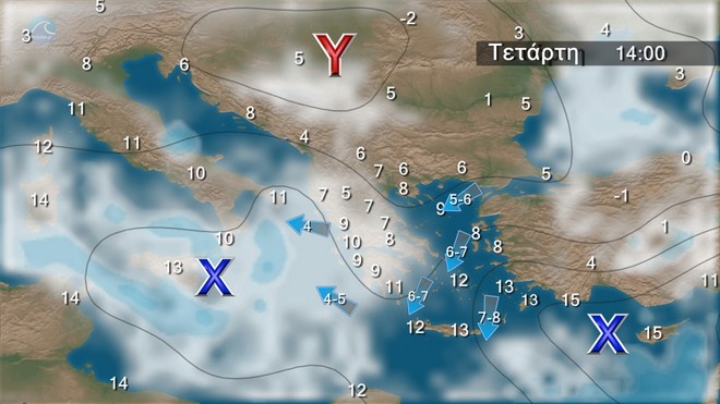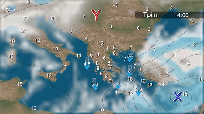 Οι άνεμοι θα πνέουν από βόρειες διευθύνσεις στα δυτικά 5 με 6 μποφόρ, στα ανατολικά 6 με 7, στο Αιγαίο 8 με 9 μποφόρ με μικρή εξασθένηση από αργά το απόγευμα.