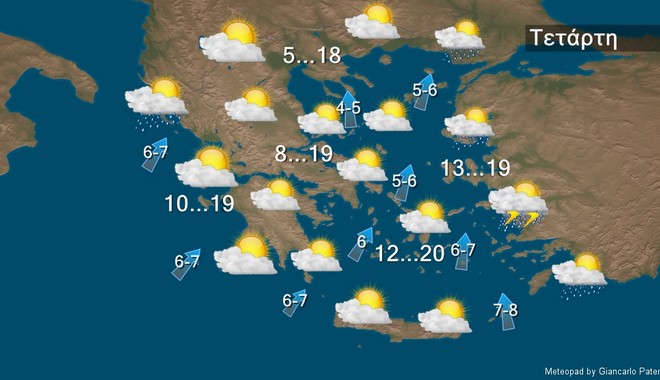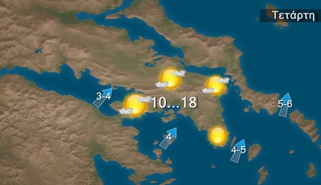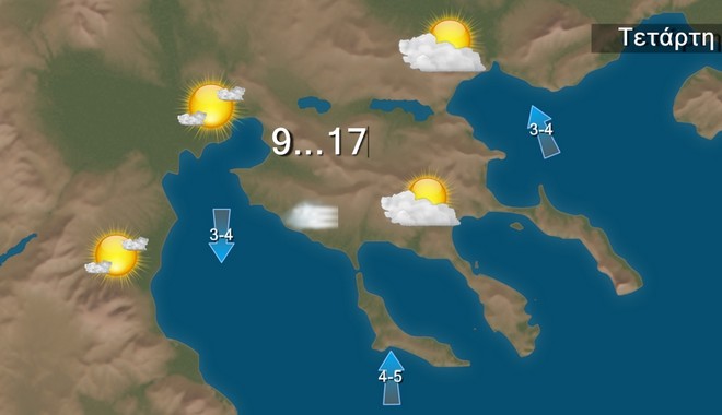 Την Τετάρτη στα νησιά του ανατολικού Αιγαίου και τη Θράκη προβλέπονται παροδικές νεφώσεις με τοπικές βροχές και τις πρώτες πρωινές ώρες καταιγίδες γρήγορα όμως ο καιρός θα βελτιωθεί. Στην υπόλοιπη χώρα προβλέπονται λίγες νεφώσεις πρόσκαιρα αυξημένες κυρίως τις πρωινές ώρες στα δυτικά και στα Δωδεκάνησα όπου θα σημειωθούν τοπικές βροχές.