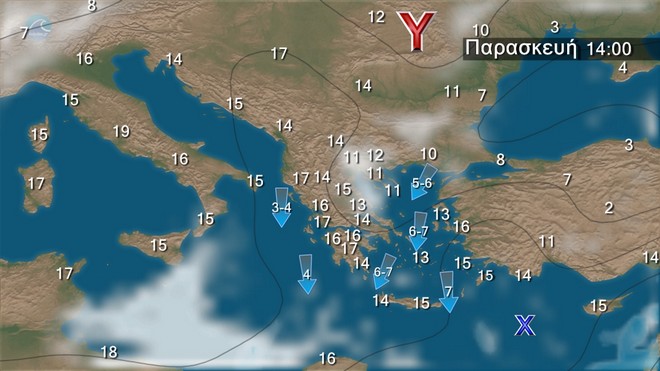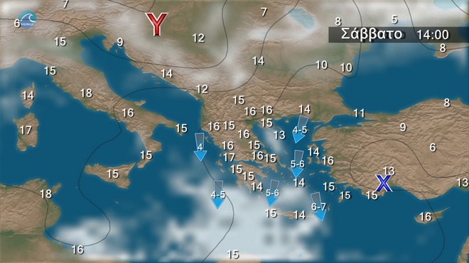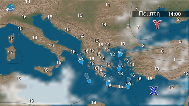 Στα δυτικά, τα νησιά του ανατολικού Αιγαίου και τα Δωδεκάνησα γενικά αίθριος καιρός. Στις υπόλοιπες περιοχές νεφώσεις παροδικά αυξημένες με ασθενείς τοπικές βροχές στα ανατολικά ηπειρωτικά, τις Σποράδες, την Εύβοια και τη βόρεια Κρήτη. Οι άνεμοι θα πνέουν βόρειοι βορειοανατολικοί, στα δυτικά 4 με 5, στα ανατολικά 5 με 7 και στο Αιγαίο 8 και στα νότια τοπικά 9 μποφόρ με βαθμιαία εξασθένηση από το απόγευμα. Η θερμοκρασία θα σημειώσει πτώση στα ανατολικά.