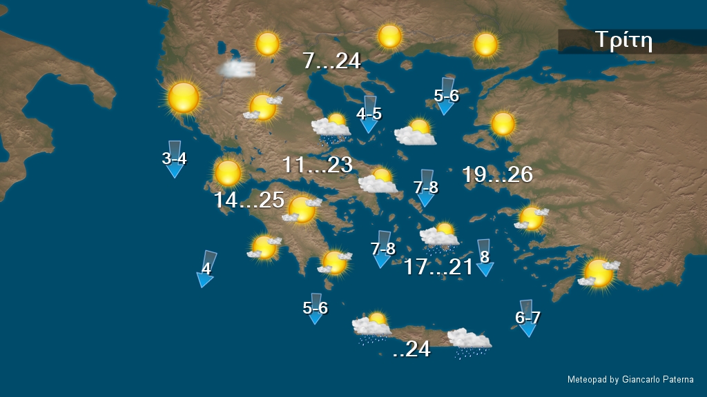 Σήμερα Τρίτη στην Κρήτη προβλέπονται βροχές. Στη δυτική και τη βόρεια Ελλάδα προβλέπεται γενικά αίθριος καιρός. Στις υπόλοιπες περιοχές θα υπάρχουν κατά διαστήματα νεφώσεις και στην ανατολική Στερεά, την Εύβοια, τις Σποράδες και τις Κυκλάδες θα σημειωθούν λίγες τοπικές βροχές. Οι άνεμοι θα πνέουν από βόρειες διευθύνσεις, στα δυτικά 3 με 5, στα ανατολικά 5 με 7 και στο Αιγαίο τοπικά 8 μποφόρ με εξασθένηση από το απόγευμα. Η θερμοκρασία θα σημειώσει μικρή άνοδο στα δυτικά και τα βόρεια.και τοπικά θα φτάσει τους 24 με 26 βαθμούς Κελσίου