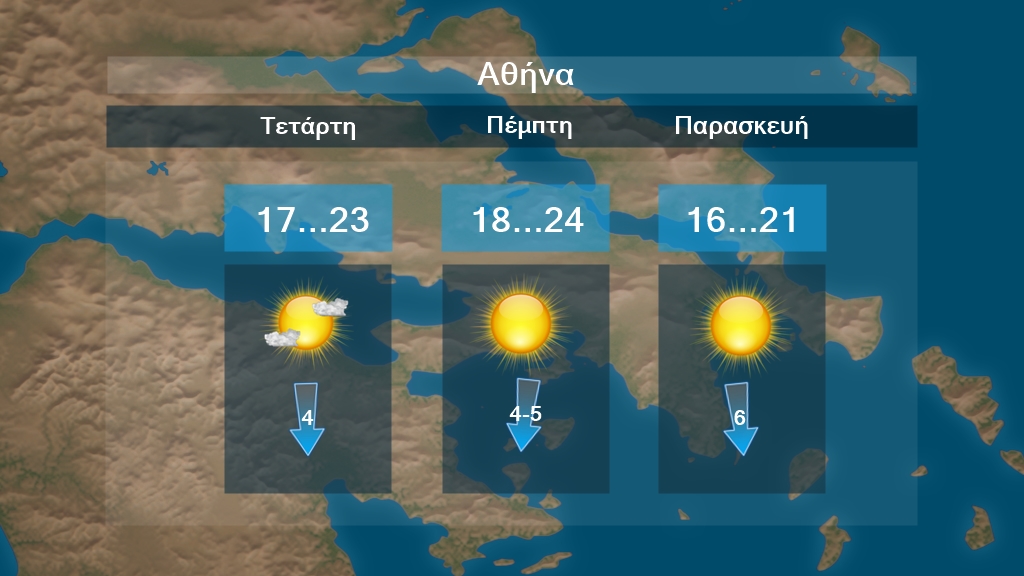 Στην ανατολική Στερεά, τις Σποράδες, την Εύβοια, τις Κυκλάδες, την Κρήτη και τα Δωδεκάνησα προβλέπονται παροδικά αυξημένες νεφώσεις με λίγες τοπικές βροχές στη βόρεια Κρήτη. Στην υπόλοιπη χώρα γενικά αίθριος καιρός. Η ορατότητα θα είναι τοπικά περιορισμένη στα δυτικά και βόρεια ηπειρωτικά τις πρωινές και βραδινές ώρες. Οι άνεμοι θα πνέουν από βόρειες διευθύνσεις 3 με 5 και στο Αιγαίο τοπικά 6 μποφόρ με σταδιακή εξασθένηση από το μεσημέρι. Η θερμοκρασία θα σημειώσει μικρή άνοδο και θα φθάσει στα βόρεια τους 21 με 23 βαθμούς και στις υπόλοιπες περιοχές τους 23 με 25 βαθμούς Κελσίου.