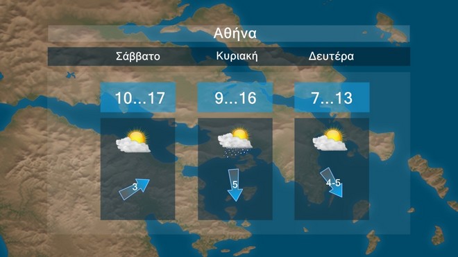 Στην Αττική προβλέπεται σχεδόν αίθριος καιρός με λίγες μόνο νεφώσεις. Οι άνεμοι θα πνέουν δυτικοί βορειοδυτικοί 3 με 5 μπ . Η θερμοκρασία θα κυμανθεί από 7 έως 17 βαθμούς Κελσίου.