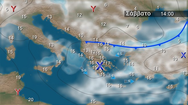 Το Σάββατο προβλέπονται νεφώσεις παροδικά αυξημένες και από το μεσημέρι θα εκδηλωθούν τοπικές βροχές. Οι άνεμοι θα πνέουν από δυτικές διευθύνσεις 3 με 5 και στα νότια τοπικά 6 μποφόρ που σταδιακά θα στραφούν σε βόρειους 5 με 6 και στο Αιγαίο τοπικά 7 μποφόρ. Η θερμοκρασία θα πέσει στα ανατολικά και βόρεια.