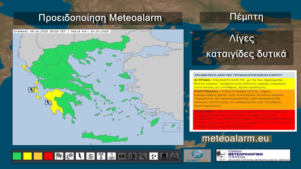 Την Πέμπτη θα έχουμε λίγες νεφώσεις που βαθμιαία στα δυτικά, τα κεντρικά και τα βόρεια θα πυκνώσουν και από το απόγευμα στα δυτικά θα σημειωθούν τοπικές βροχές και στο Ιόνιο μεμονωμένες καταιγίδες. Τοπικά περιορισμένη ορατότητα στα κεντρικά και βόρεια τις πρωινές ώρες.
