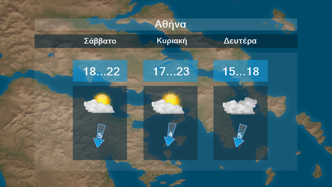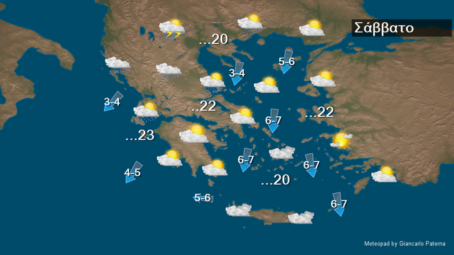 Οι άνεμοι θα πνέουν στα δυτικά ανατολικοί 3 με 5 μποφόρ και βαθμιαία βόρειοι βορειοδυτικοί με την ίδια ένταση. Στα ανατολικά θα πνέουν από βόρειες διευθύνσεις 4 με 6 και τοπικά στο Αιγαίο 7 μποφόρ, με βαθμιαία εξασθένηση. Η θερμοκρασία δεν θα σημειώσει αξιόλογη μεταβολή.