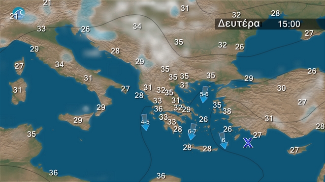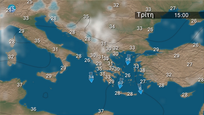 Γενικά αίθριος καιρός. Τις μεσημβρινές και απογευματινές ώρες στα ηπειρωτικά θα αναπτυχθούν τοπικές νεφώσεις και στα δυτικά και βόρεια κυρίως ορεινά θα εκδηλωθούν τοπικοί όμβροι και στα βορειοδυτικά πιθανώς μεμονωμένες καταιγίδες. Οι άνεμοι θα πνέουν από βόρειες διευθύνσεις στα δυτικά 3 με 5, στα ανατολικά 5 με 6 και στο Αιγαίο κατά τη διάρκεια της ημέρας τοπικά 7 μποφόρ. Η θερμοκρασία θα σημειώσει μικρή πτώση στα ανατολικά την Τετάρτη.