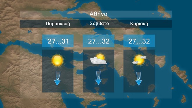 Στην Αθήνα προβλέπεται σχεδόν αίθριος καιρός. Η θερμοκρασία θα έχει μέγιστες τιμές περί τους 31 με 32 βαθμούς Κελσίου.