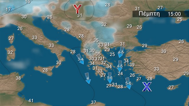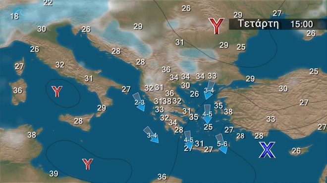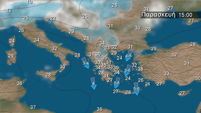 Γενικά αίθριος καιρός με πρόσκαιρες τοπικές νεφώσεις τις μεσημβρινές και απογευματινές ώρες στα ηπειρωτικά κυρίως στα ορεινά. Οι άνεμοι θα πνέουν βόρειοι βορειοδυτικοί 3 με 5 και στο ανατολικό Αιγαίο τοπικά 6 μποφόρ. Η θερμοκρασία θα σημειώσει άνοδο και θα φτάσει κατά τόπους στα ηπειρωτικά τους 37 με 38 βαθμούς Κελσίου.