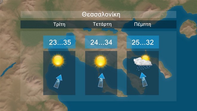 Στη Θεσσαλονίκη ο καιρός θα κυλήσει αίθριος έως την Τετάρτη με τον υδράργυρο να φτάνει τους 34 με 35 βαθμούς Κελσίου . Την Πέμπτη θα εκδηλωθεί αστάθεια και η θερμοκρασία θα πέσει στους 32 βαθμούς Κελσίου