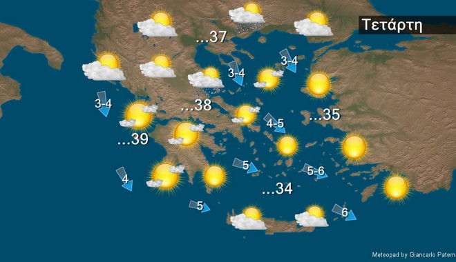 Αρχικά στη δυτική και την κεντρική Μακεδονία και βαθμιαία στην Ήπειρο, τη δυτική Στερεά και τη Θεσσαλία προβλέπονται λίγες νεφώσεις παροδικά αυξημένες με τοπικούς όμβρους και μεμονωμένες καταιγίδες, κυρίως τις μεσημβρινές και απογευματινές ώρες. Στις υπόλοιπες περιοχές προβλέπεται γενικά αίθριος καιρός και μόνο στα ηπειρωτικά τις απογευματινές ώρες θα αναπτυχθούν πρόσκαιρες νεφώσεις. Οι άνεμοι θα πνέουν από βόρειες διευθύνσεις 3 με 5 και στο Αιγαίο 6 τοπικά 7 μποφόρ. Η θερμοκρασία δεν θα σημειώσει αξιόλογη μεταβολή. Θα φτάσει κατά τόπους στα ηπειρωτικά τους 34 με 36 βαθμούς Κελσίου.