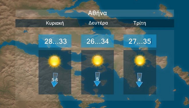 Στην Αθήνα προβλέπεται σχεδόν αίθριος καιρός Η θερμοκρασία θα έχει μέγιστες τιμές περί τους 33 με 35 βαθμούς Κελσίου