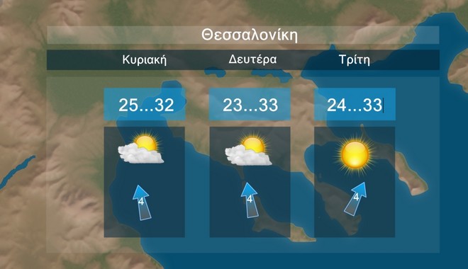 Στη Θεσσαλονίκη προβλέπονται λίγες νεφώσεις κατά περιόδους αυξημένες έως τη Δευτέρα . Η θερμοκρασία θα έχει μέγιστες τιμές περί τους 32 με 33 βαθμούς Κελσίου