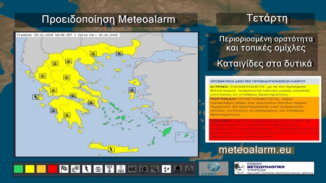 Κατά τόπους περιορισμένη ορατότητα ή ομίχλες τις πρωινές ώρες. Οι άνεμοι θα πνέουν μεταβλητοί 3 με 4 και στα νότια πελάγη δυτικοί 4 με 5 μποφόρ. Η θερμοκρασία θα σημειώσει πτώση στα βόρεια και θα φτάσει τους 24 βαθμούς στα βόρεια , στα υπόλοιπα ηπειρωτικά και το Ιόνιο τους 25 με 26 και στα νησιά του Αιγαίου τους 25 βαθμούς Κελσίου.