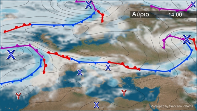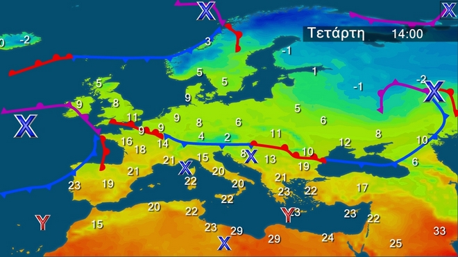 Στον γενικό χάρτη της Ευρώπης διακρίνονται οι οικογένειες των βαρομετρικών χαμηλών που υπάρχουν από τα δυτικά προς τα ανατολικά τα οποία όμως μόνο πρόσκαιρα θα μας επηρεάσουν.