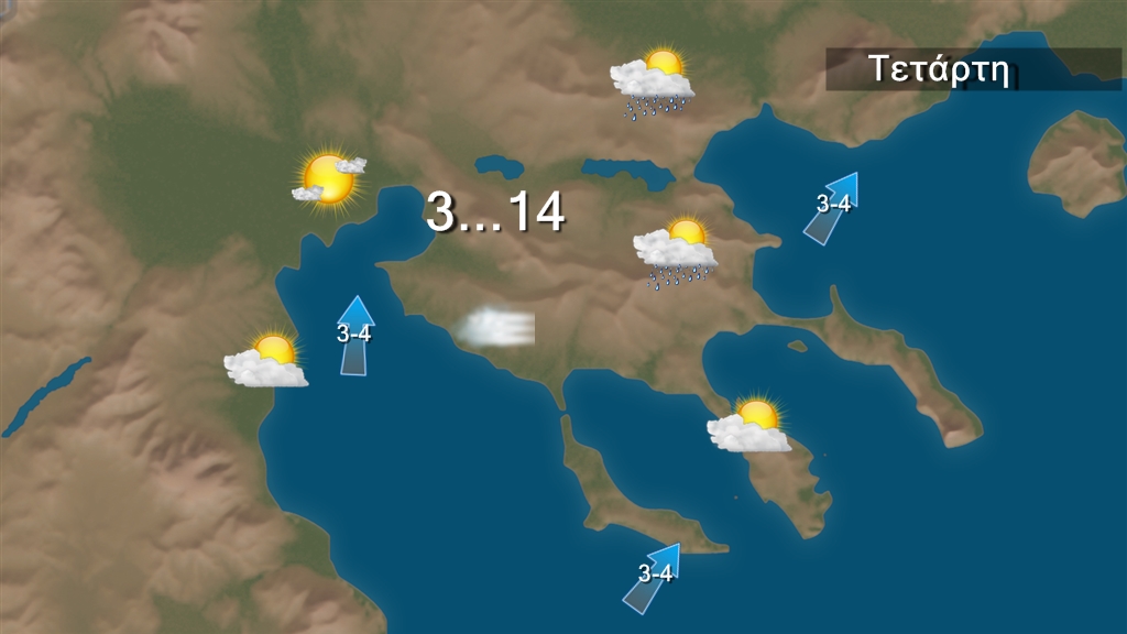 Οι άνεμοι θα πνέουν βόρειοι βορειοδυτικοί 3 με 4 μποφόρ, που από το μεσημέρι θα στραφούν σε νότιους με την ίδια ένταση. Η θερμοκρασία θα κυμανθεί από 3 έως 14 βαθμούς Κελσίου.