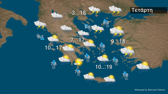 Νεφώσεις παροδικά αυξημένες με τοπικές βροχές. Σποραδικές καταιγίδες θα εκδηλωθούν κυρίως στα βόρεια, στην ανατολική και νότια νησιωτική χώρα, όπου πιθανώς τις πρώτες πρωινές ώρες να είναι πρόσκαιρα ισχυρές. Λίγα χιόνια θα πέσουν στα ορεινά κυρίως της κεντρικής και βόρειας χώρας. Τα φαινόμενα από το απόγευμα βαθμιαία θα εξασθενήσουν και θα περιοριστούν στα νοτιοανατολικά. Οι άνεμοι θα πνέουν στα δυτικά, τα κεντρικά και βόρεια δυτικοί βορειοδυτικοί 3 με 5 και στο Ιόνιο τοπικά 6 μποφόρ. Στα υπόλοιπα θα πνέουν από νότιες διευθύνσεις 4 με 5 και στο ανατολικό Αιγαίο τις πρωινές ώρες τοπικά 6 μποφόρ. Η θερμοκρασία θα σημειώσει μικρή περαιτέρω πτώση.