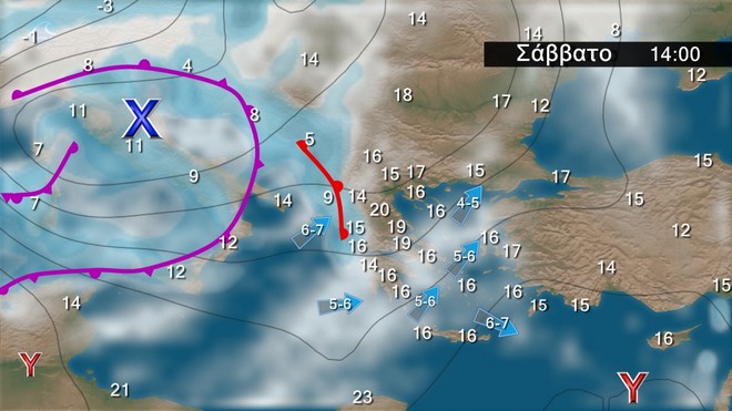 Νεφώσεις με βροχές και σποραδικές καταιγίδες αρχικά στο Ιόνιο, τα ηπειρωτικά και γρήγορα και στις υπόλοιπες περιοχές. Τα φαινόμενα πιθανώς να είναι κατά τόπους ισχυρά στα δυτικά, τα βόρεια, βαθμιαία στα νησιά του ανατολικού Αιγαίου, τα Δωδεκάνησα και πρόσκαιρα στα ανατολικά ηπειρωτικά, τις Κυκλάδες και την Κρήτη. Χιονοπτώσεις θα σημειωθούν στα ηπειρωτικά ορεινά κυρίως της κεντρικής και βόρειας χώρας. Οι άνεμοι θα πνέουν στα δυτικά αρχικά από νότιες διευθύνσεις 5 με 7, πρόσκαιρα στο Ιόνιο 8 μποφόρ στρεφόμενοι γρήγορα σε δυτικούς βορειοδυτικούς 4 με 6 μποφόρ. Στα ανατολικά νότιοι νοτιοανατολικοί 6 με 7, στο Αιγαίο 8 τοπικά 9 μποφόρ με μικρή εξασθένηση από το απόγευμα , ενώ το βράδυ θα στραφούν σε νοτιοδυτικούς. Η θερμοκρασία θα σημειώσει πτώση.