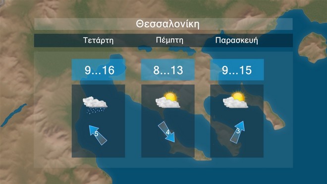 Τοπικές νεφώσεις προβλέπονται στη Θεσσαλονίκη με βροχές την Τετάρτη. Οι θερμοκρασίες θα κυμαίνονται περί τους 13 με 16 βαθμούς Κελσίου.