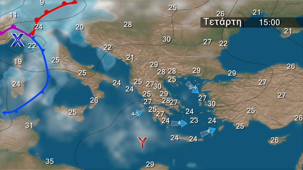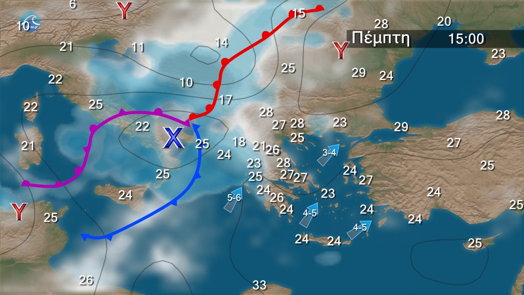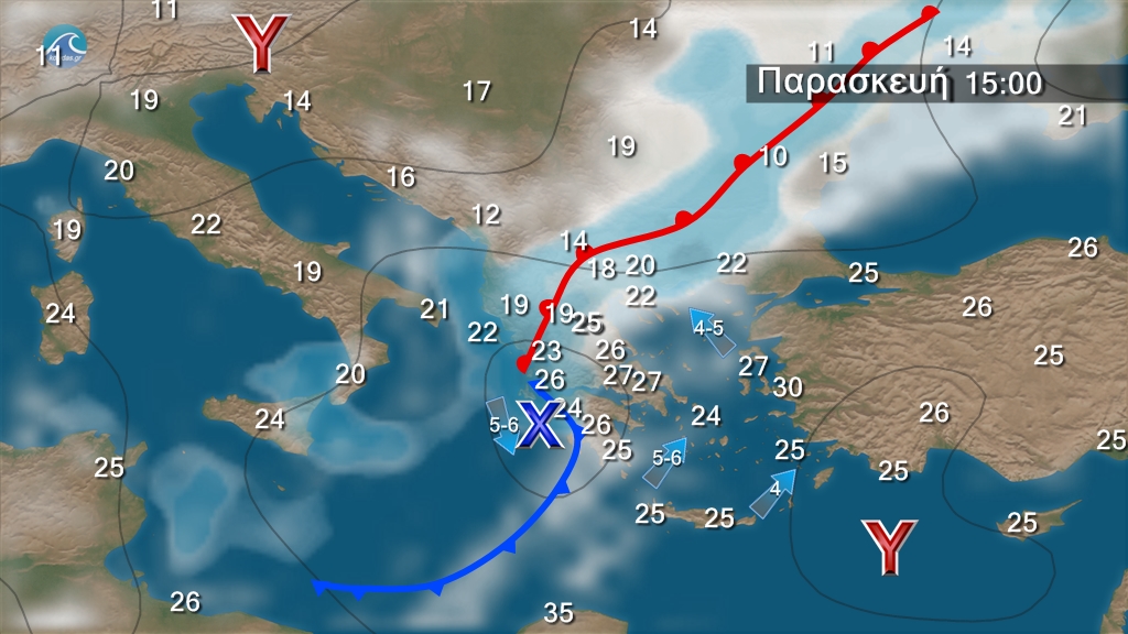 Στα δυτικά, τα κεντρικά και τα βόρεια νεφώσεις με βροχές και σποραδικές καταιγίδες. Τα φαινόμενα είναι πιθανόν να είναι κατά τόπους ισχυρά, μέχρι το απόγευμα στα δυτικά, από το μεσημέρι στα βορειοανατολικά ηπειρωτικά και το βράδυ στα νησιά του βορειοανατολικού Αιγαίου. Στις υπόλοιπες περιοχές λίγες νεφώσεις παροδικά αυξημένες με πιθανότητα τοπικών βροχών μικρής διάρκειας. Οι άνεμοι θα πνέουν από νότιες διευθύνσεις 4 με 6 και στα πελάγη τοπικά 7 μποφόρ. Από τις μεσημβρινές ώρες βαθμιαία στα δυτικά και τη Μακεδονία θα στραφούν σε βόρειους βορειοδυτικούς 5 με 6 μποφόρ. Η θερμοκρασία δε θα σημειώσει αξιόλογη μεταβολή.