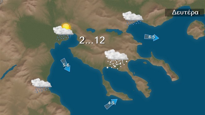 Σήμερα Δευτέρα στη δυτική Ελλάδα προβλέπονται αυξημένες νεφώσεις με βροχές, που από αργά το απόγευμα στα βόρεια θα ενταθούν. Στην υπόλοιπη χώρα προβλέπονται λίγες νεφώσεις που γρήγορα θα αυξηθούν και θα εκδηλωθούν τοπικές βροχές αρχικά στη δυτική Μακεδονία, τη Θράκη και το ανατολικό Αιγαίο, από το απόγευμα στην υπόλοιπη Μακεδονία και το βράδυ στη Θεσσαλία και τις Σποράδες. Το βράδυ τα φαινόμενα στα βόρεια θα ενταθούν και θα σημειωθούν χιονοπτώσεις στα ορεινά της βόρειας χώρας, τη νύχτα πρόσκαιρα σε ημιορεινές περιοχές της Μακεδονίας της Θράκης και της Ηπείρου. Τις πρωινές ώρες η ορατότητα στα ηπειρωτικά και την Κρήτη θα είναι τοπικά περιορισμένη.