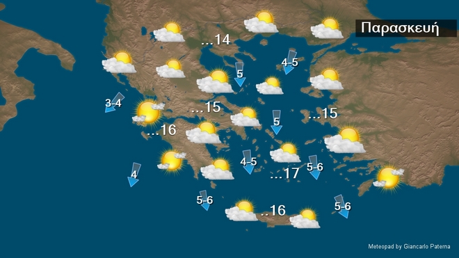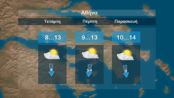 Στην Εύβοια, τις Κυκλάδες και την Κρήτη και τις πρωινές ώρες στην ανατολική Θεσσαλία, την ανατολική Στερεά, την ανατολική Πελοπόννησο, τις Σποράδες νεφώσεις τοπικά αυξημένες με ασθενείς βροχές. Στην υπόλοιπη χώρα γενικά αίθριος καιρός. Οι άνεμοι θα πνέουν από βόρειες διευθύνσεις, στα δυτικά 3 με 4 μποφόρ, στα ανατολικά 4 με 6 και στο Αιγαίο μέχρι το μεσημέρι τοπικά 7 μποφόρ.