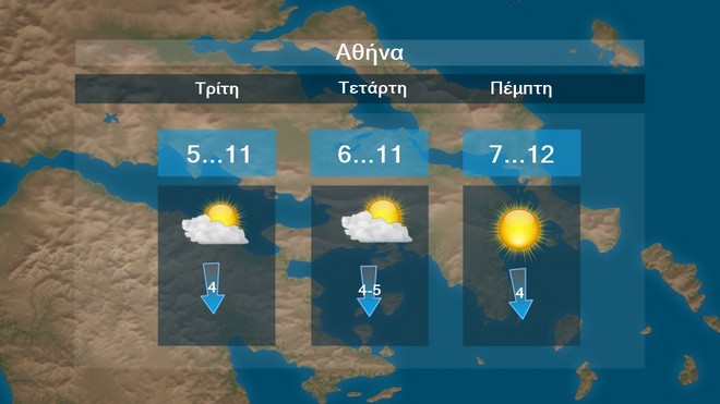 Στην Αθήνα προβλέπονται λίγες τοπικές νεφώσεις. . Η μέγιστη θερμοκρασία δεν θα ξεπεράσει τους 11 με 12 βαθμούς Κελσίου