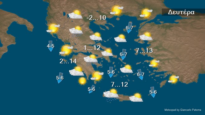 Από το μεσημέρι και από τα βόρεια ο καιρός θα βελτιωθεί. Οι άνεμοι θα πνέουν ανατολικοί βορειοανατολικοί 5 με 6 και τοπικά στο Αιγαίο 7 μποφόρ. Η θερμοκρασία θα σημειώσει μικρή πτώση στα ανατολικά. Παγετός θα σημειωθεί κατά τόπους στα ηπειρωτικά τις πρωινές και βραδινές ώρες.