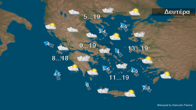 Τη Δευτέρα σε όλη τη χώρα προβλέπονται αραιές νεφώσεις κατά τόπους πιο πυκνές, με ασθενείς τοπικές βροχές αρχικά στα δυτικά και βαθμιαία και στις υπόλοιπες περιοχές. Οι μετεωρολογικές συνθήκες ευνοούν τη μεταφορά αφρικανικής σκόνης. Οι άνεμοι θα πνέουν νοτιοανατολικοί 3 με 5 και στα νοτιοδυτικά πρόσκαιρα έως 6 μποφόρ. Η θερμοκρασία δεν θα σημειώσει αξιόλογη μεταβολή και θα φτάσει κατά τόπους τους 18 με 19 βαθμούς Κελσίου.