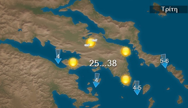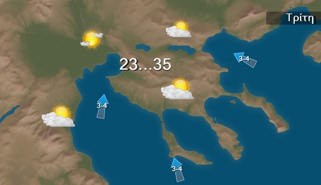 Την Τρίτη προβλέπεται γενικά αίθριος καιρός με πρόσκαιρες νεφώσεις στα ηπειρωτικά τις μεσημβρινές και τις απογευματινές ώρες, οπότε είναι πιθανό να σημειωθούν τοπικοί όμβροι στα ορεινά της Μακεδονίας.