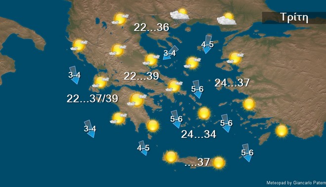 Οι άνεμοι θα πνέουν, στο Ιόνιο μεταβλητοί 3 με 4 μποφόρ και στο Αιγαίο βόρειοι 5 με 6 μποφόρ. Η θερμοκρασία παρά τη μικρή πτώση θα διατηρηθεί σε υψηλά επίπεδα. Στα βόρεια δεν θα ξεπεράσει τους 36 βαθμούς Κελσίου. Στα υπόλοιπα ηπειρωτικά θα φτάσει τους 38 με 39 βαθμούς και στα νησιά του Αιγαίου τους 34 με 37 βαθμούς Κελσίου.