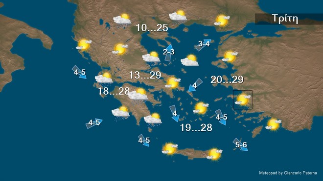 Την Τρίτη αρχικά στο Ιόνιο, και βαθμιαία στα βόρεια και από τις μεσημβρινές ώρες στα υπόλοιπα ηπειρωτικά και τις Σποράδες, προβλέπονται τοπικές βροχές και, κυρίως στο Ιόνιο και πιθανόν την Πελοπόννησο και τη Μακεδονία, μεμονωμένες καταιγίδες. Στις υπόλοιπες περιοχές θα επικρατήσει γενικά αίθριος καιρός.