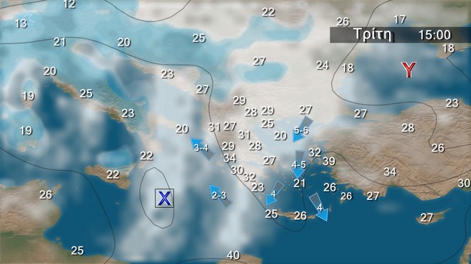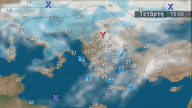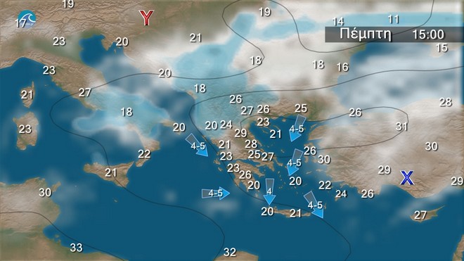 Στα νότια γενικά αίθριος καιρός. Στην υπόλοιπη χώρα αραιές νεφώσεις,οι οποίες από το μεσημέρι στα βόρεια θα είναι κατά τόπους πιο πυκνές.Οι συγκεντρώσεις αφρικανικής σκόνης θα παραμείνουν αυξημένες στην ατμόσφαιρα.Οι άνεμοι θα πνέουν στα δυτικά νοτιοανατολικοί, στα ανατολικά από βόρειες διευθύνσεις 3 με 4 και στα πελάγη τοπικά 5 μποφόρ.Η θερμοκρασία θα σημειώσει μικρή πτώση στα βόρεια, αλλά στα κεντρικά και νότια θα διατηρηθεί σε υψηλά επίπεδα.