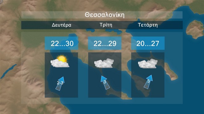 Στη Θεσσαλονίκη ο καιρός θα κυλήσει με τοπικές νεφώσεις παροδικά αυξημένες. Η θερμοκρασία θα έχει μέγιστες τιμές περί τους 27 με 30 βαθμούς Κελσίου.
