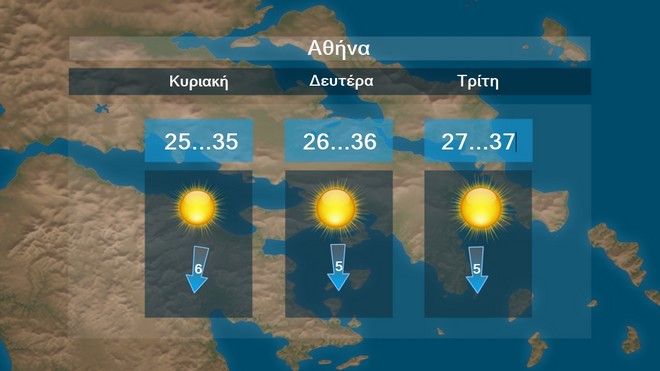 Στην Αθήνα προβλέπεται αίθριος καιρός. Η μέγιστη θερμοκρασία θα κυμαίνεται περί τους 35 με 37 βαθμούς Κελσίου. Για τις επόμενες ημέρες στην Αττική η θερμοκρασία δεν θα αλλάξει σημαντικά όπως μπορούμε να διακρίνουμε από το σχετικό μετεώγραμμα.