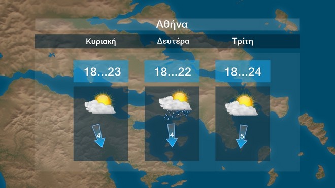 Στην Αθήνα προβλέπονται νεφώσεις παροδικά αυξημένες με αστάθεια από την Κυριακή και μετά Η μέγιστη θερμοκρασία θα κυμαίνεται περί τους 22 με 24 βαθμούς Κελσίου.