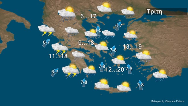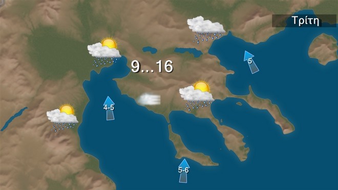 Τη Τρίτη στα δυτικά προβλέπονται τοπικές βροχές που από το μεσημέρι θα ενταθούν και θα εκδηλωθούν σποραδικές καταιγίδες κατά τόπους ισχυρές. Τα έντονα φαινόμενα από τις βραδινές ώρες θα επηρεάσουν τη Θράκη και τα νησιά του ανατολικού Αιγαίου. Στην υπόλοιπη χώρα θα υπάρχουν λίγες νεφώσεις που από το μεσημέρι στα κεντρικά και βόρεια ηπειρωτικά, θα αυξηθούν και θα σημειωθούν τοπικές βροχές. Λίγα χιόνια θα πέσουν στα βορειοδυτικά ορεινά. Οι άνεμοι θα πνέουν νοτιοδυτικοί 4 με 6, βαθμιαία στα πελάγη 7 και στο Αιγαίο τοπικά 8 μποφόρ με εξασθένηση το βράδυ στα δυτικά. Η θερμοκρασία θα σημειώσει μικρή πτώση και θα έχει μέγιστη τιμή στα βόρεια τους 17 βαθμούς, στα υπόλοιπα ηπειρωτικά και το Ιόνιο τους 18 βαθμούς Κελσίου, στις Κυκλάδες και την Κρήτη τους 20 βαθμούς και στο Ανατολικό Αιγαίο και τα Δωδεκάνησα τους 19 βαθμούς Κελσίου.