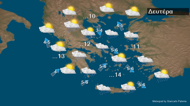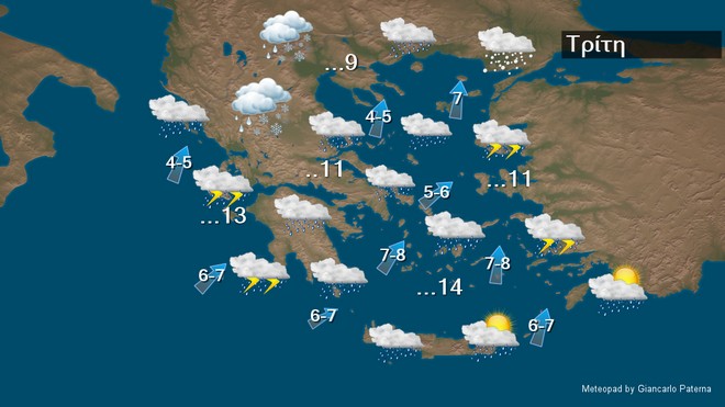 Στην Κρήτη και τα Δωδεκάνησα προβλέπονται νεφώσεις με τοπικές βροχές και τις πρώτες πρωινές ώρες μεμονωμένες καταιγίδες, γρήγορα όμως ο καιρός θα βελτιωθεί. Στην υπόλοιπη χώρα ο καιρός θα είναι γενικά αίθριος στο μεγαλύτερο διάστημα της ημέρας, αλλά από το απόγευμα στα δυτικά θα αναπτυχθούν νεφώσεις, οι οποίες τις βραδινές ώρες θα πυκνώσουν και θα σημειωθούν τοπικές βροχές κυρίως στα βορειοδυτικά. Λίγα χιόνια θα πέσουν στα βορειοδυτικά ορεινά τις βραδινές ώρες. Οι άνεμοι θα πνέουν αρχικά βορειοδυτικοί 4 με 6 μποφόρ. Βαθμιαία από το μεσημέρι στα δυτικά και από αργά το απόγευμα στα ανατολικά θα στραφούν σε νότιους νοτιοδυτικούς με την ίδια ένταση. Η θερμοκρασία θα σημειώσει μικρή άνοδο κυρίως ως προς τις μέγιστες τιμές της και θα φθάσει στα βόρεια ηπειρωτικά τους 10 με 11 βαθμούς, στα υπόλοιπα ηπειρωτικά τους 13 με 14 βαθμούς και στα νησιά τους 14 με 16 βαθμούς Κελσίου. Παγετός θα σημειωθεί κατά τόπους στα κεντρικά και βόρεια ηπειρωτικά τις πρωινές και βραδινές ώρες.