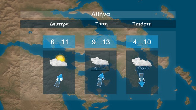Στην Αθήνα θα έχουμε βροχές από την Τρίτη. Η θερμοκρασία θα έχει μέγιστες τιμές περί τους 10 με 13 βαθμούς Κελσίου.