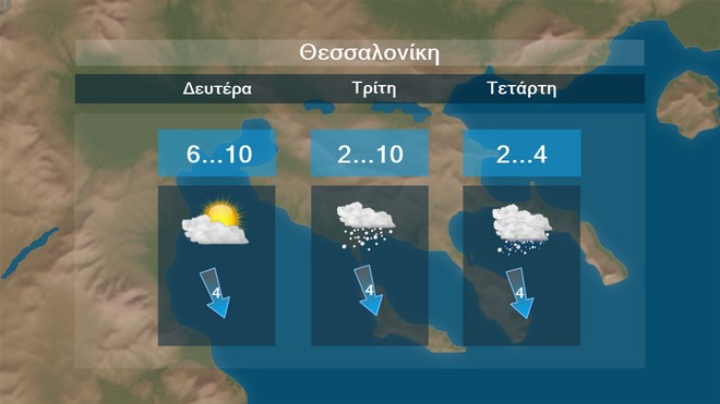 Στη Θεσσαλονίκη προβλέπονται νεφώσεις με χιονόνερο ή χιόνια από την Τρίτη. Η θερμοκρασία από τους 10 βαθμούς έως την Τρίτη θα πέσει την Τετάρτη στους 4 βαθμούς βαθμούς Κελσίου.