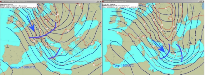 Καθώς διαπιστώνουμε ότι θα συνεχιστεί η ίδια περίπου ροή των ανωτέρων αερίων μαζών πάνω από την περιοχή μας, όπου αυτές από τα βορειοδυτικά κινούνται προς τα νοτιοανατολικά (σχήμα) προβήκαμε στην έκδοση εκτάκτου δελτίου επιδείνωσης του καιρού. Οι ψυχρές αέριες μάζες στην ανώτερη ατμόσφαιρα θα δημιουργήσουν ευνοϊκές συνθήκες να δημιουργηθεί βαθύ βαρομετρικό χαμηλό στην περιοχή μας με χιονοπτώσεις, βροχές και πολύ θυελλώδεις ανέμους στα πελάγη, όπως περιγράφονται στο έκτακτο δελτίο επιδείνωσης του καιρού (ΕΔΕΚ)