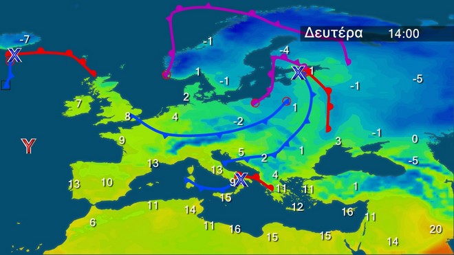 Στον χάρτη των βαρομετρικών συστημάτων της Ευρώπης παρατηρούμε το χαμηλό που θα μας επηρεάσει να έχει αρχίσει να σχηματίζεται στη νότια Ιταλία και το οποίο το επόμενο διήμερο θα κινηθεί γρήγορα ανατολικά και θα μας επηρεάσει.