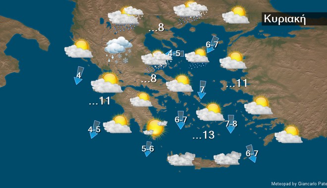 Τοπικές νεφώσεις κατά διαστήματα αυξημένες στα ανατολικά ηπειρωτικά, τα νησιά του βορείου Αιγαίου, την Εύβοια, τις Κυκλάδες και την Κρήτη όπου θα σημειωθούν βροχές ή χιονόνερο, ενώ χιόνια θα πέσουν στα ορεινά και ημιορεινά καθώς και σε περιοχές στα κεντρικά και βόρεια με χαμηλότερο υψόμετρο. Τα φαινόμενα θα είναι κατά κανόνα ασθενή. Οι άνεμοι θα πνέουν ανατολικοί βορειοανατολικοί 5 με 7, στα πελάγη τοπικά 8 και στα νότια πιθανόν 9 μποφόρ.